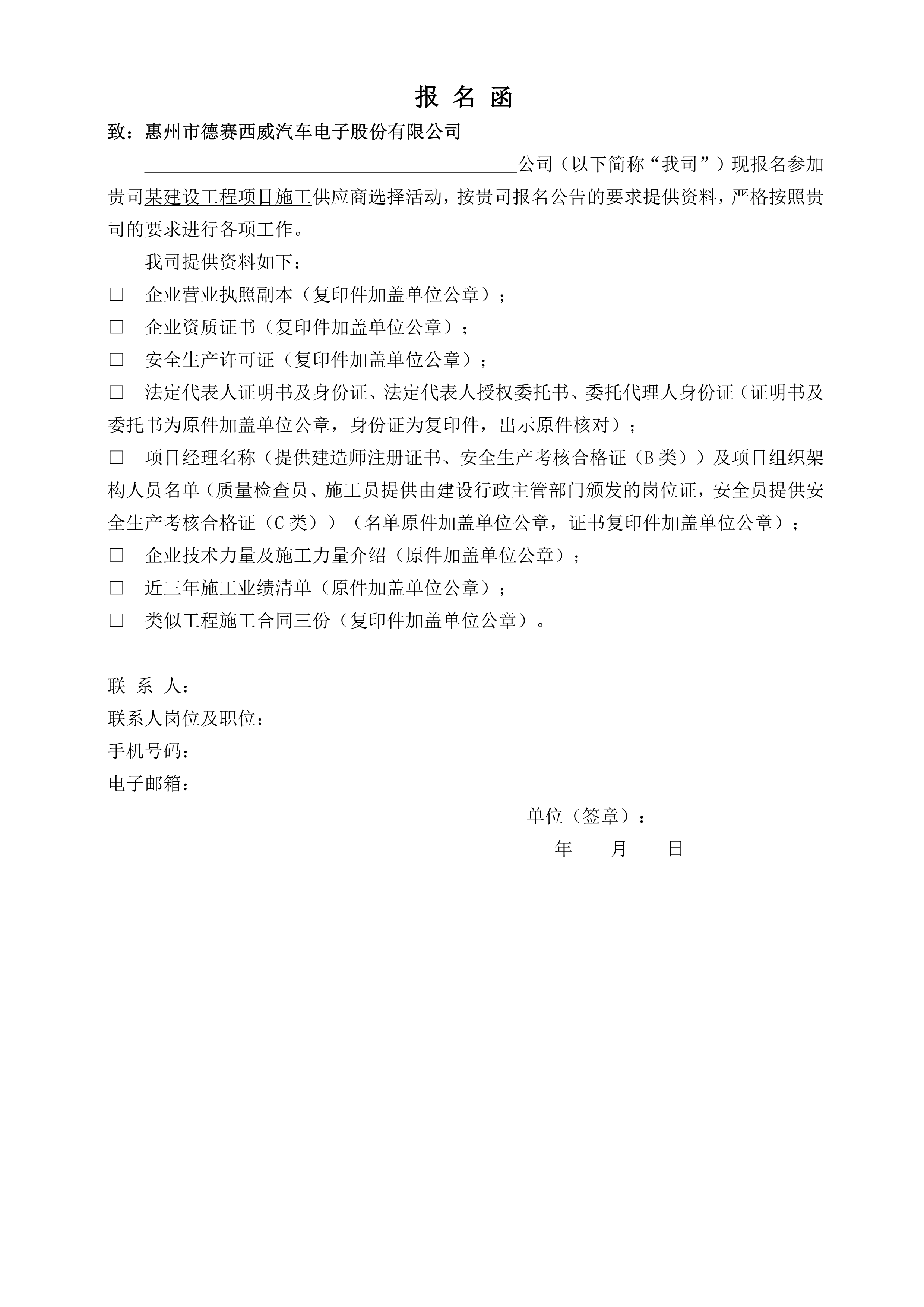需提供的资料包括:①三证合一的企业营业执照副本;;②企业资质证书;;③清静生产允许证;;(注:①~③项应为复印件加盖单位公章)④法定代表人证实书及身份证、法定代表人授权委托书、委托署理人身份证;;⑤本工程拟接纳项目司理名称(提供制作师注册证书、清静生产审核及格证(B类))及项目组织架构职员名单(质量检查员、施工员提供由建设行政主管部分揭晓的岗位证,,,,清静员提供清静生产审核及格证(C类));;⑥企业手艺实力及施工实力先容;;⑦施工业绩清单(要求提供近三年业绩清单原件,,,,3份以上能反应公司实力的类似工程施工条约复印件加盖单位公章);;⑧报名函(见附件)。。